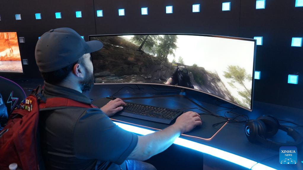 A man experiences a 49-inch mini LED curved gaming screen of Chinese company TCL during the 2023 Consumer Electronics Show (CES) in Las Vegas, the United States, Jan. 6, 2023. (Photo by Zeng Hui/Xinhua)