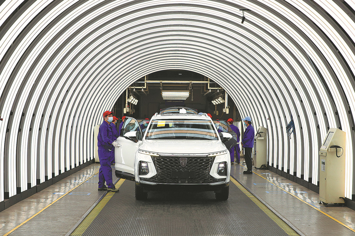 Workers assemble cars in Saic Motor's Lingang plant in Pudong New District, Shanghai, on April 23. [Photo by Zhu Xingxin/China Daily]