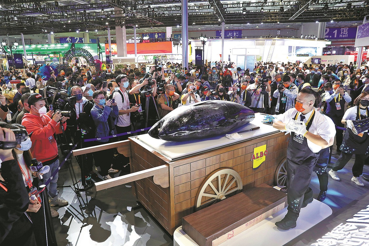 A tuna fish weighing 353 kilograms attracts attention on Nov 6, 2021, during the 4th China International Import Expo in Shanghai. [Photo by Zhu Xingxin/China Daily]