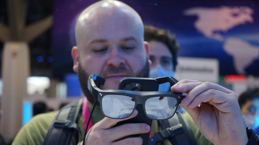A man experiences augmented reality (AR) glasses of Chinese company TCL during the 2023 Consumer Electronics Show (CES) in Las Vegas, the United States, Jan. 6, 2023. (Photo by Zeng Hui/Xinhua)