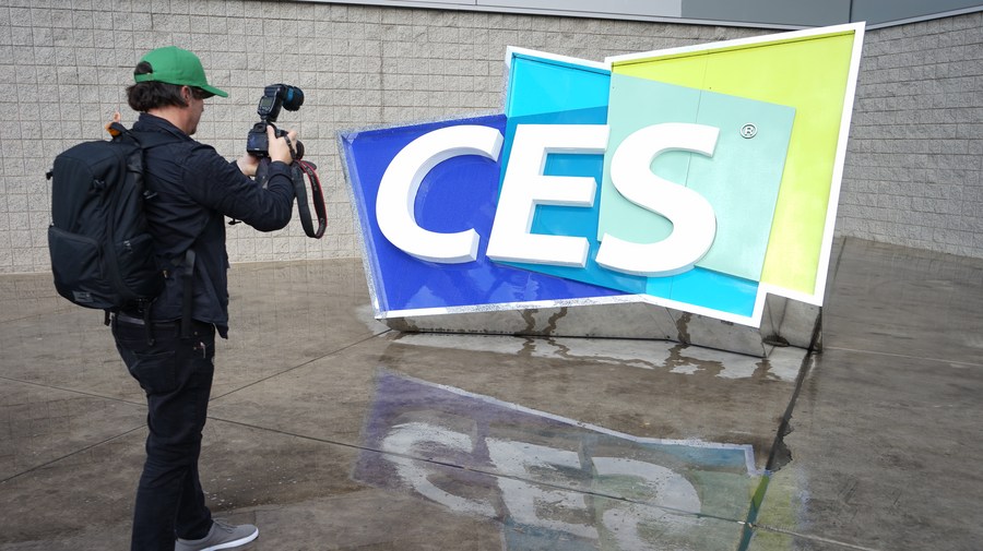 A man takes pictures of a CES logo during the 2023 Consumer Electronics Show (CES) in Las Vegas, the United States, Jan. 5, 2023. (Photo by Zeng Hui/Xinhua)