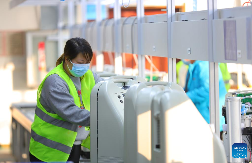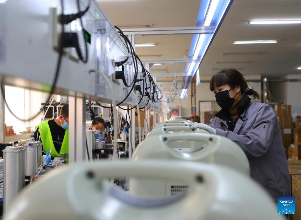 Employees of a medical enterprise work on the production line of oxygen concentrators in Shenyang, northeast China's Liaoning Province, Jan. 5, 2023. (Xinhua/Yang Qing)