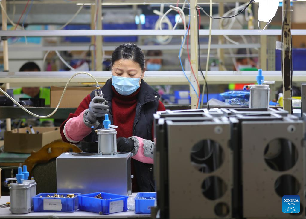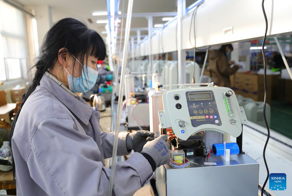 An employee of a medical enterprise works on the production line of oxygen concentrators in Shenyang, northeast China's Liaoning Province, Jan. 5, 2023. (Xinhua/Yang Qing)