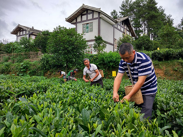A photo shows villagers picking tea leaves on the hillside in Meitan county, Guizhou province. [Photo by Xing Yi/chinadaily.com.cn]
