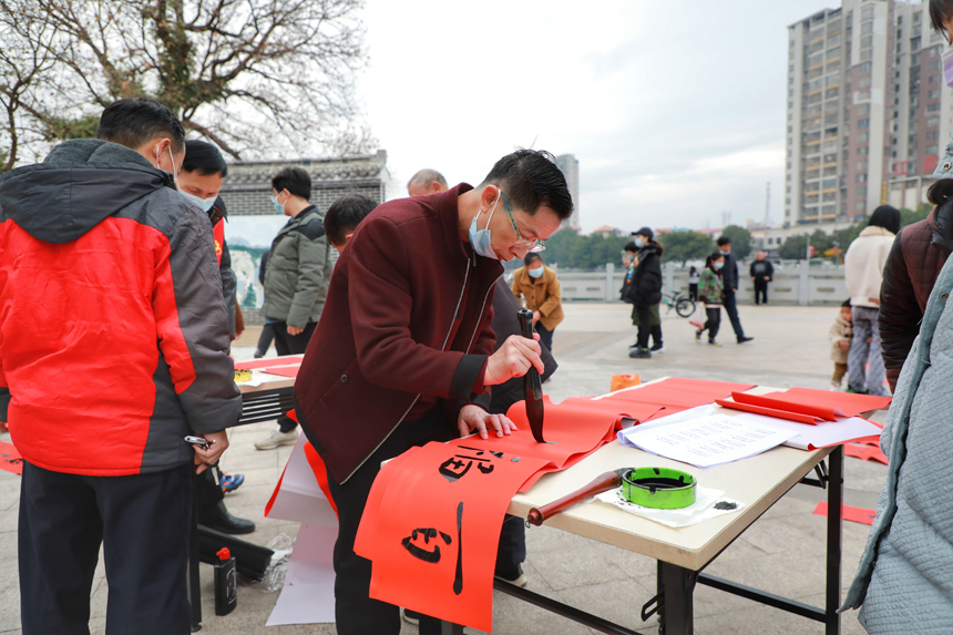 Volunteers from Quannan county’s calligrapher association write red couplets for residents free of charge at a park in Quannan county, Ganzhou, east China’s Jiangxi Province. (Photo/Yin Qiqi)