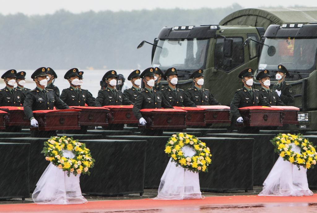 Soldiers escort coffins containing the remains of Chinese People's Volunteers (CPV) martyrs at the Taoxian international airport in Shenyang, northeast China's Liaoning Province, Sept. 16, 2022.