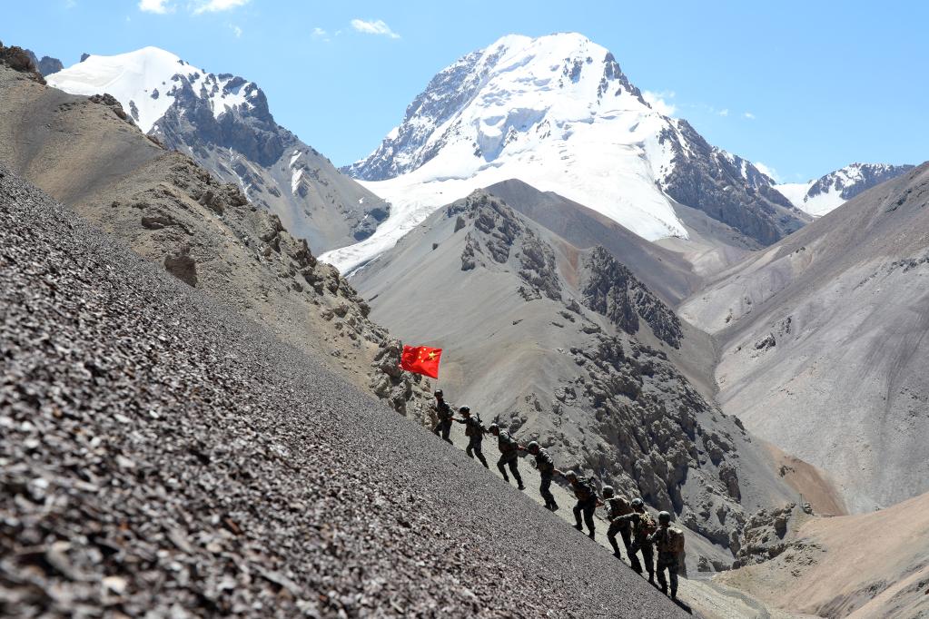 Soldiers of a patrol team of the frontier forces climb the Daobei mountain in northwest China's Xinjiang Uygur Autonomous Region, Aug. 1, 2022. Aug. 1, 2022 marked the 95th anniversary of the founding of the Chinese People's Liberation Army (PLA). (Photo by Wang Junqiang/Xinhua)