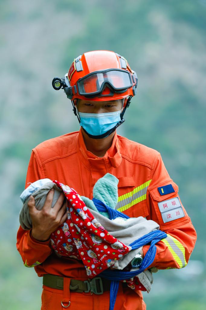 Rescuer Zhang Zili transfers a two-month-old infant from quake-hit Wandong Village of Detuo Town in Luding County, southwest China's Sichuan Province, Sept. 6, 2022.