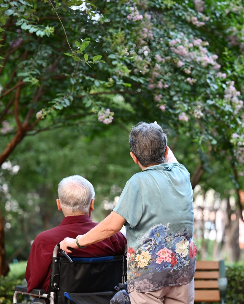Duan Zhaoyi (R) pushes Gu Weili in a wheelchair as they enjoy flowers in north China's Tianjin Municipality on July 30, 2022.