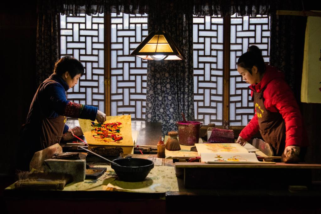 Artist Yin Dongxiang (L) and her daughter Xiao Yang make copies of nianhua, a type of centuries-old Chinese woodcut New Year picture, at a workshop in Tantou Township of Longhui County, Shaoyang, central China's Hunan Province, Jan. 21, 2022. (Xinhua/Chen Sihan)