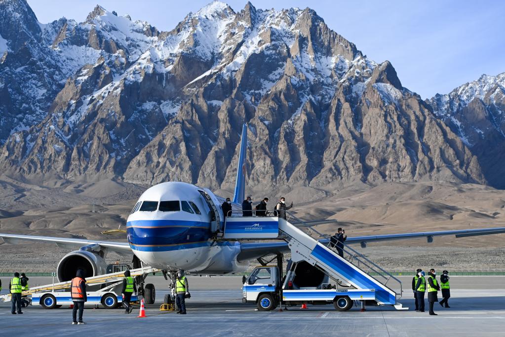 Passengers get off the first flight at the Taxkorgan airport after arrival in Taxkorgan Tajik Autonomous County, northwest China's Xinjiang Uygur Autonomous Region, Dec. 23, 2022.