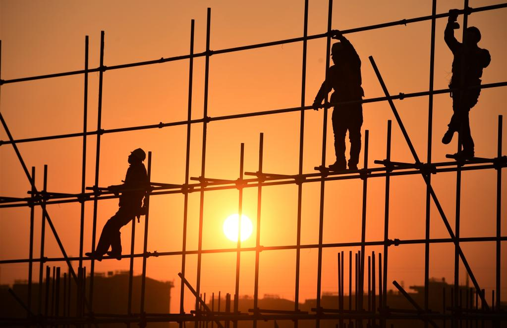 Staff members of Shanghai Civil Engineering Co., Ltd. of CREC (China Railway Engineering Group Ltd.) work at sunrise at the construction site of the D section of the Rongxi relocation residential project in Xiong'an New Area, north China's Hebei Province, Jan. 1, 2022. (Photo by Fu Xinchun/Xinhua)