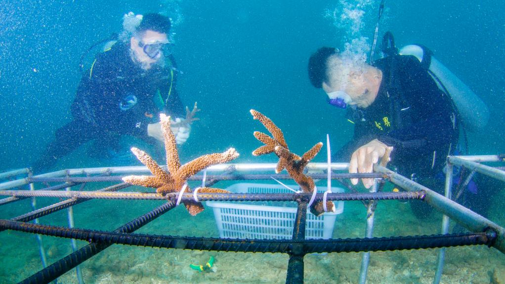Staff members transplant corals in the waters of Fenjiezhou Island of Hainan Province, south China, June 7, 2022.