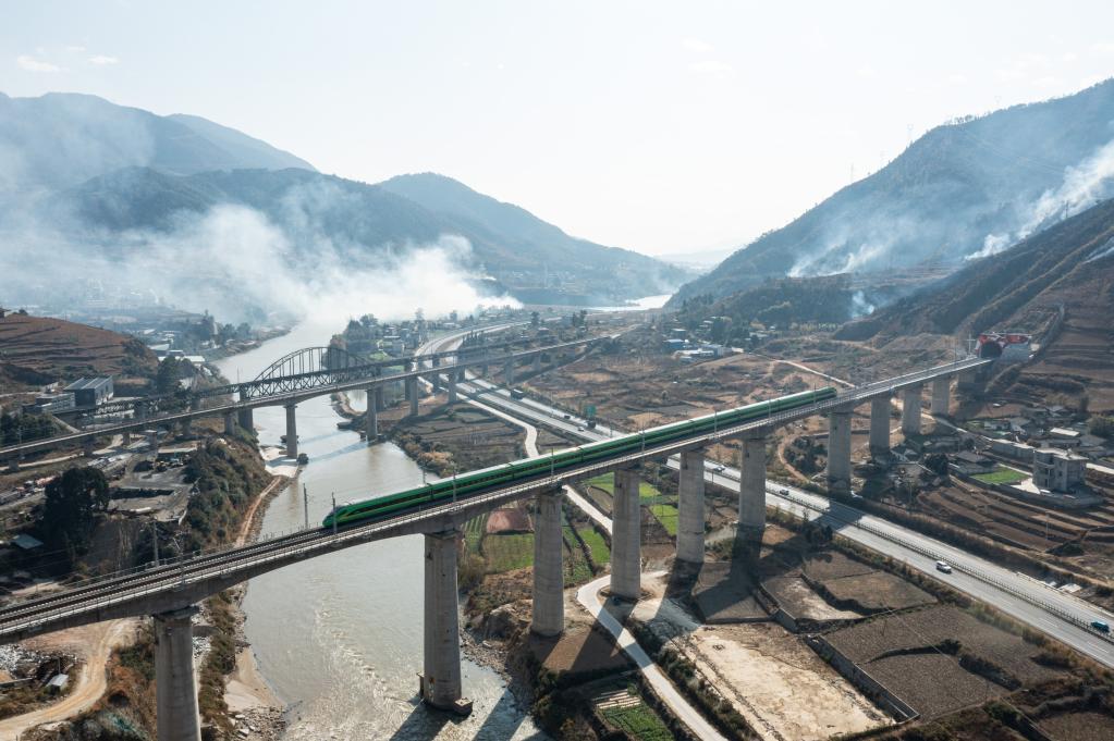 With a designed speed of 160 km per hour, the new 915-km line, which runs almost parallel to an existing railway link between Chengdu and Kunming, cuts the travel time from 19 hours to 7.5 hours. (Xinhua/Jiang Hongjing)