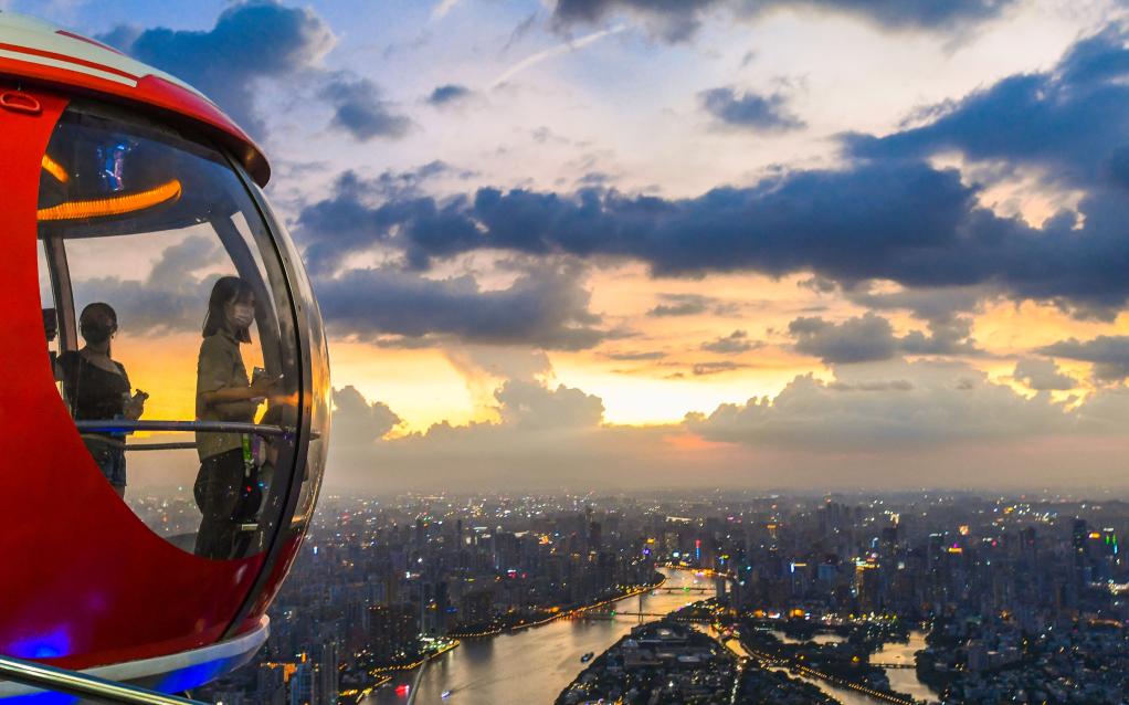 Tourists ride a ferris wheel at the top of the Canton Tower, a landmark in Guangzhou, south China's Guangdong Province, Aug. 7, 2022. Tourist attractions that blend modernity with history are gaining popularity among visitors to Guangzhou, one of the top summer travel destinations in China. (Xinhua/Liu Dawei)