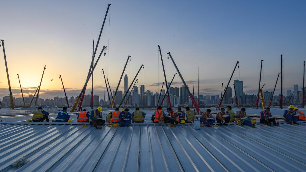 Workers have a meal during break time at the construction site of an emergency hospital project aided by China's central authorities in the Lok Ma Chau Loop area of Hong Kong, south China, March 31, 2022. (Xinhua/Liang Xu)
