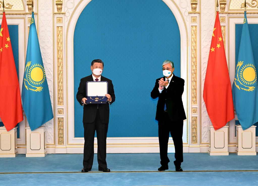 Chinese President Xi Jinping receives the Order of the Golden Eagle, or "Altyn Qyran" Order, awarded by Kazakh President Kassym-Jomart Tokayev at the Ak Orda Presidential Palace in Nur-Sultan, Kazakhstan, Sept. 14, 2022. (Xinhua/Rao Aimin)