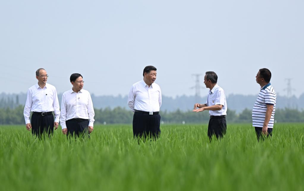 Chinese President Xi Jinping, also general secretary of the Communist Party of China Central Committee and chairman of the Central Military Commission, visits a high standard paddy field base and is briefed on the experimental paddy seed breeding and the promotion of planting, in Yongfeng Village of Taihe Town in Dongpo District, Meishan City, southwest China's Sichuan Province, June 8, 2022. Xi made an inspection tour of Sichuan Province on June 8, 2022. (Xinhua/Xie Huanchi)