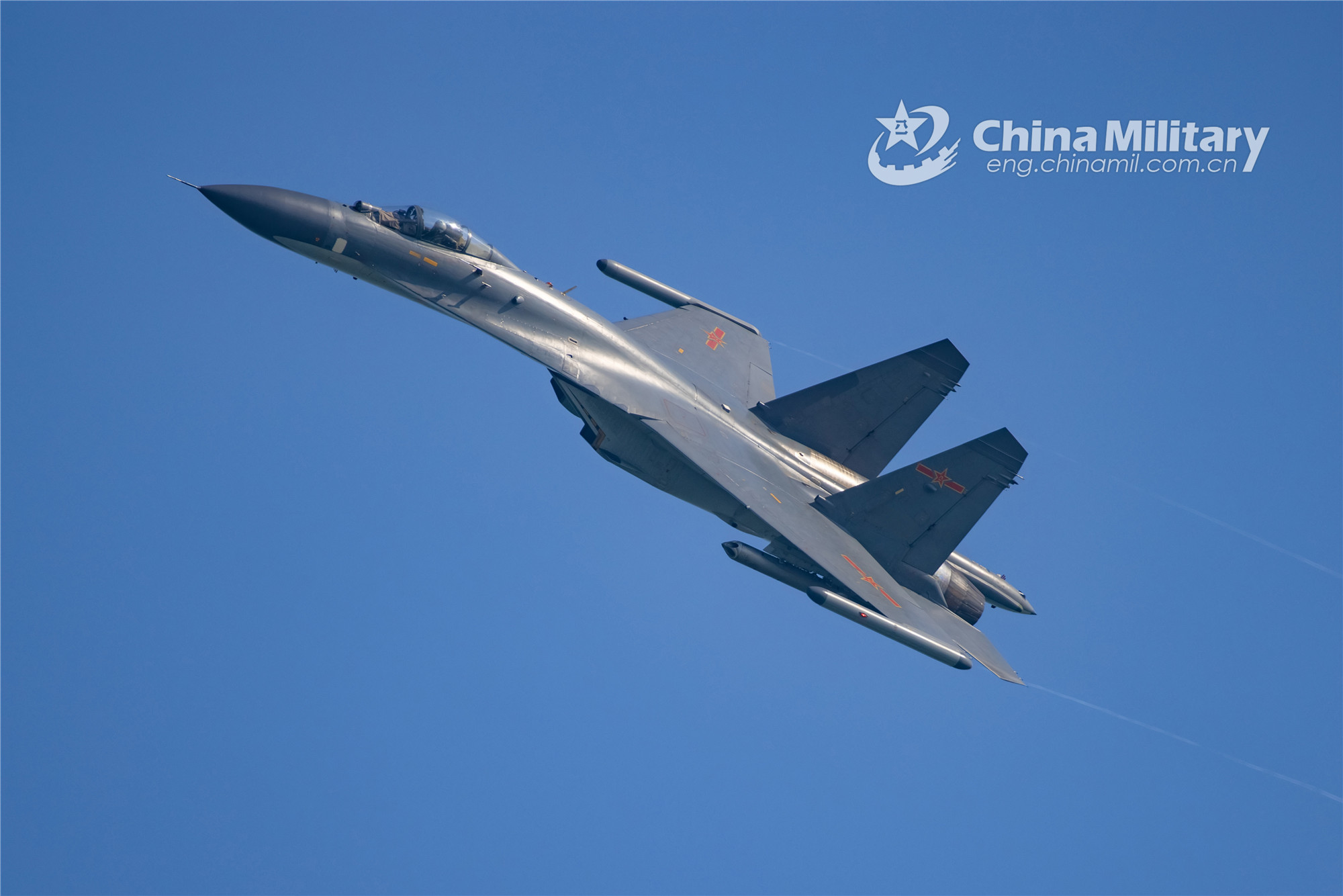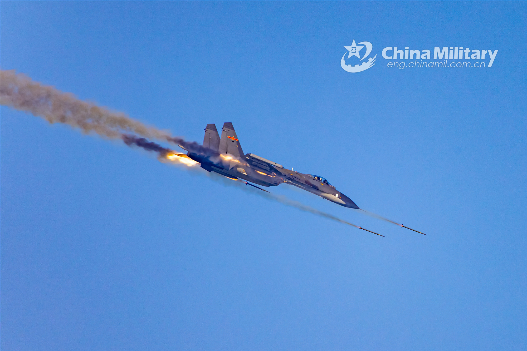 A fighter jet attached to an aviation brigade of the air force under the PLA Southern Theater Command flies away from the simulated aerial combat zone during a live-fire training exercise on December 8, 2022. (eng.chinamil.com.cn/Photo by Liu Hang)