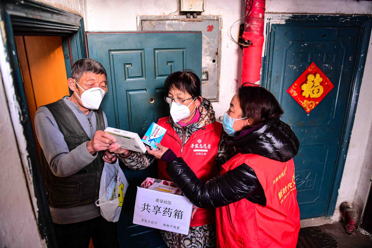 Volunteers provide medicine for a senior resident of Tiexi district in Shenyang, Liaoning province. CHINA DAILY