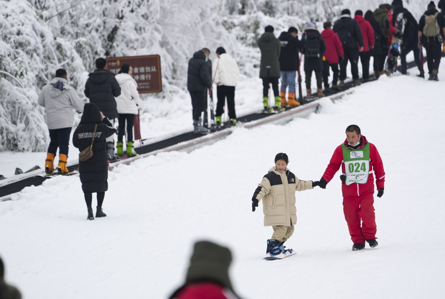 A child practices skiing under the guidance of an instructor at a ski resort in Chongqing, southwest China, Jan. 1, 2023. (Xinhua/Liu Chan)