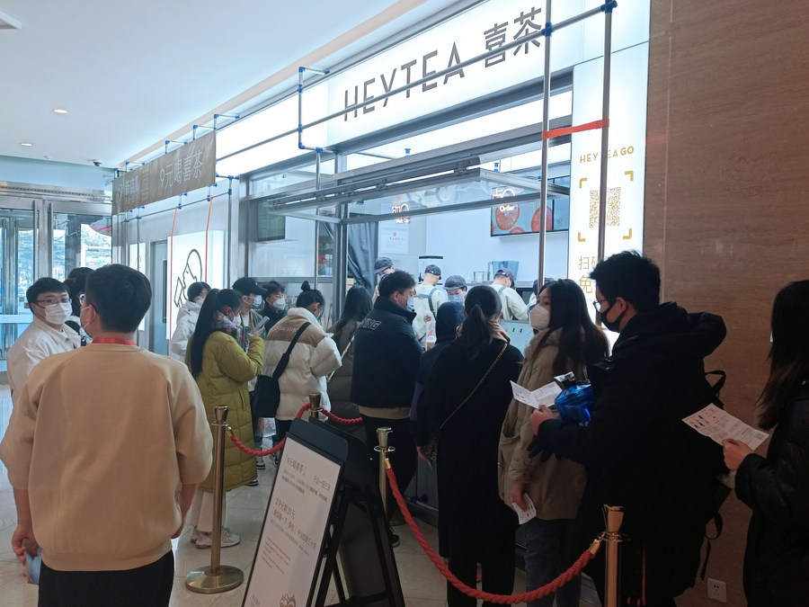 At a milk tea shop on the first floor of the plaza, queuing customers crowd the 15-square-meter store. It takes 15 minutes for a customer to get their tea after ordering.