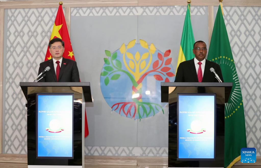 ADDIS ABABA, Jan. 10 (Xinhua) -- Chinese Foreign Minister Qin Gang on Tuesday addressed members of the press along with Ethiopian Deputy Prime Minister and Foreign Minister Demeke Mekonnen, after their talks in Addis Ababa.