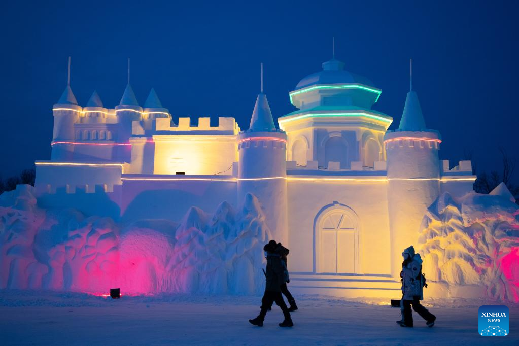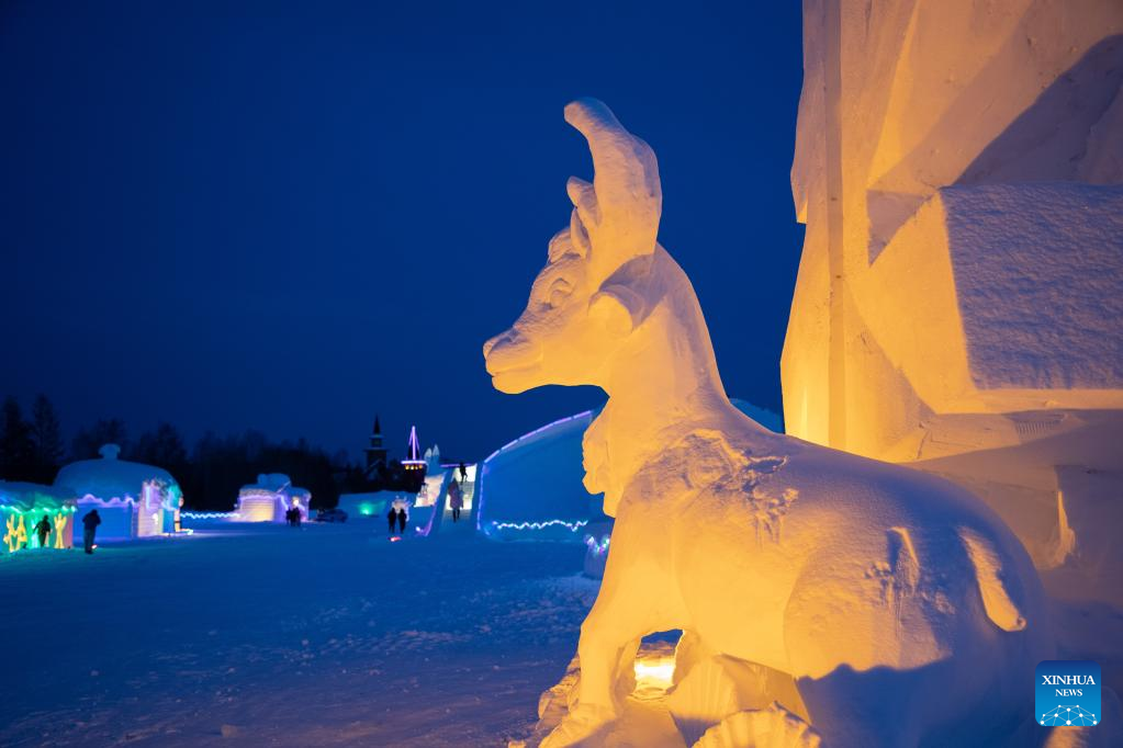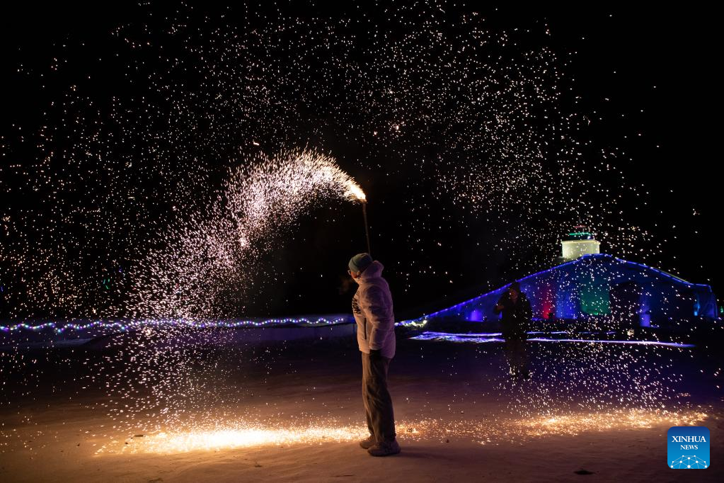 This photo taken on Jan. 7, 2023 shows a night view of an ice and snow park in Beiji Village of Mohe, northeast China's Heilongjiang Province. (Xinhua/Zhang Tao)