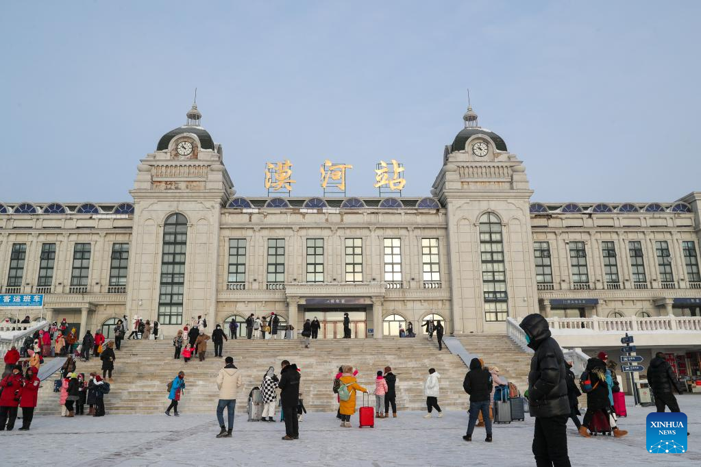 Tourists pose for photos in front of the Mohe Railway Station in Mohe, northeast China's Heilongjiang Province, Jan. 7, 2023. (Xinhua/Zhang Tao)