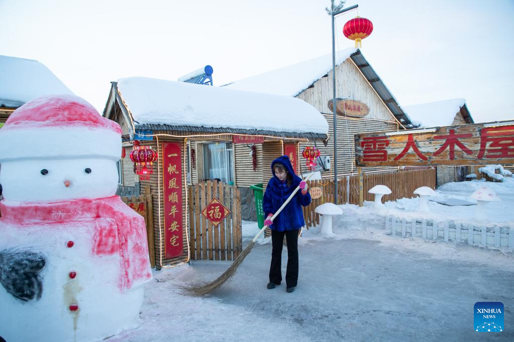 Shi Ruijuan, owner of a B&B guesthouse, sweeps the ground in Beiji Village of Mohe, northeast China's Heilongjiang Province, Jan. 7, 2023. (Xinhua/Zhang Tao)