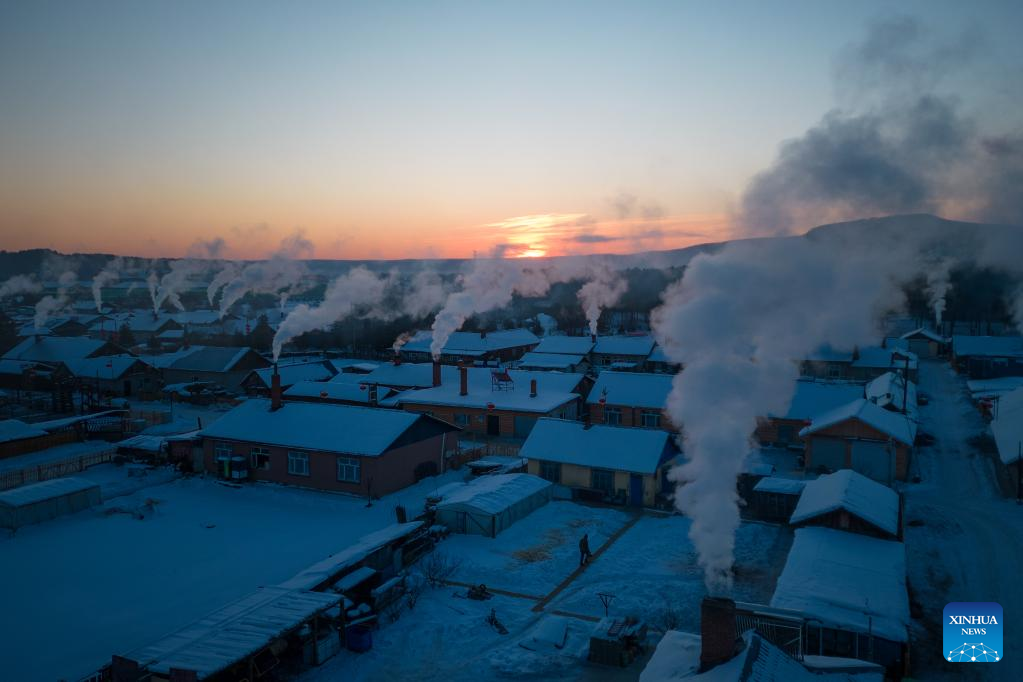 This aerial photo taken on Jan. 8, 2023 shows an early morning view of Beiji Village in Mohe, northeast China's Heilongjiang Province. (Xinhua/Zhang Tao)
