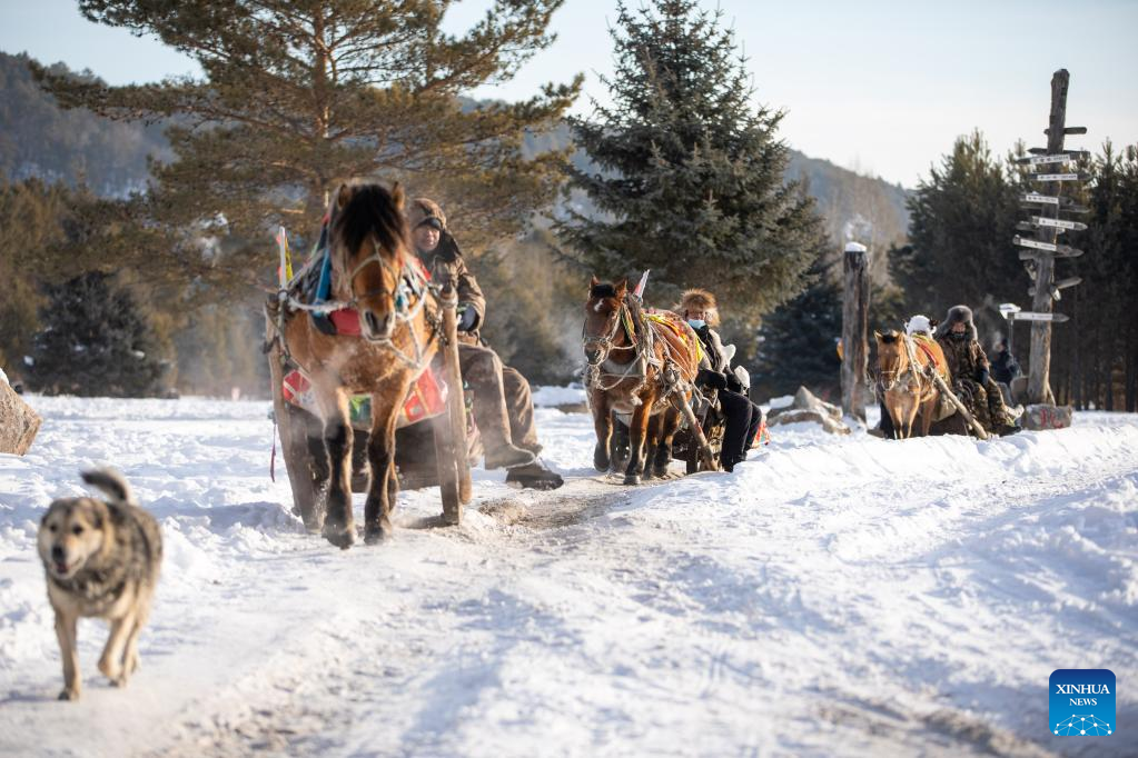 Tourists experience horse-drawn sleigh rides in Beiji Village of Mohe, northeast China's Heilongjiang Province, Jan. 10, 2023. (Xinhua/Zhang Tao)