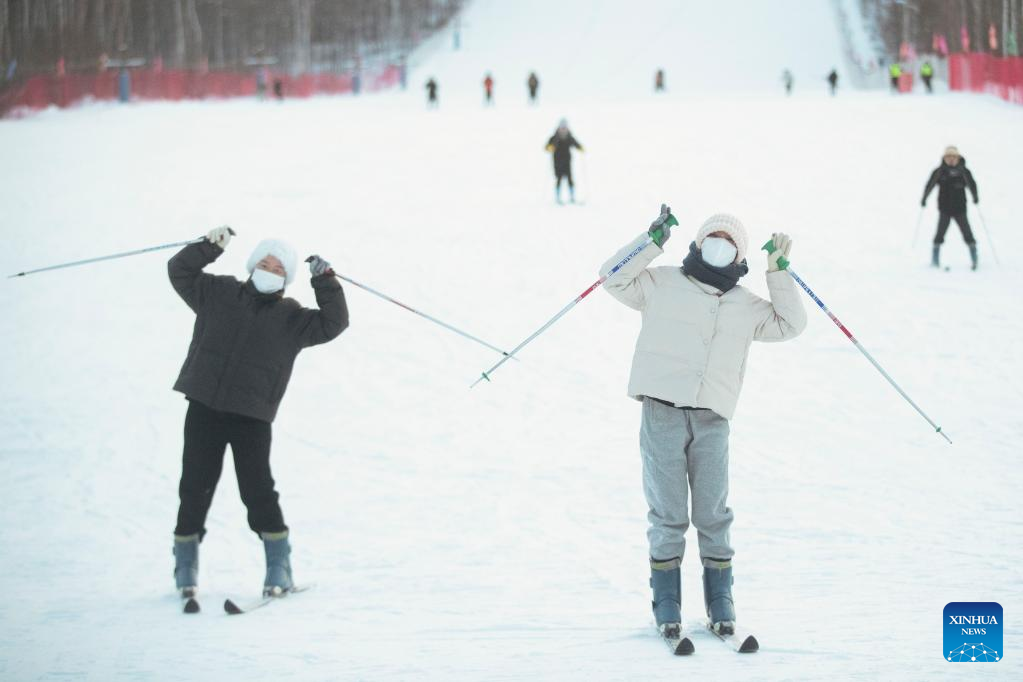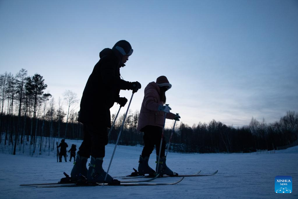 Tourists enjoy skiing at a ski resort in the Beiji Village in Mohe, northeast China's Heilongjiang Province, Jan. 7, 2023. (Xinhua/Zhang Tao)