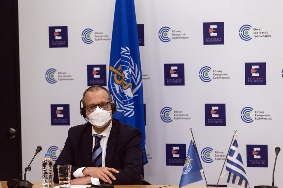 World Health Organization (WHO) Regional Director for Europe Hans Kluge attends a joint press conference in Athens, Greece, on April 15, 2021. (Xinhua/Marios Lolos)