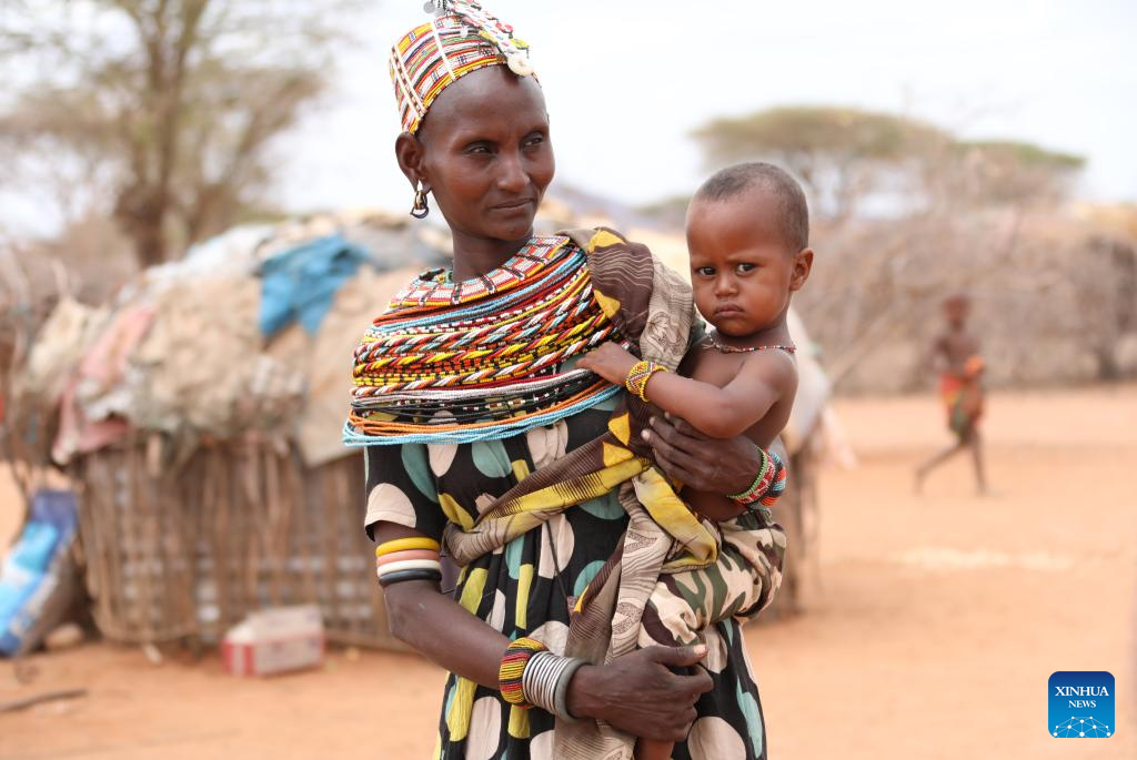 A woman holding a child in her arms is seen in a drought-affected village in the town of Laisamis, Marsabit County, Kenya, Aug. 26, 2022. (Xinhua/Dong Jianghui)