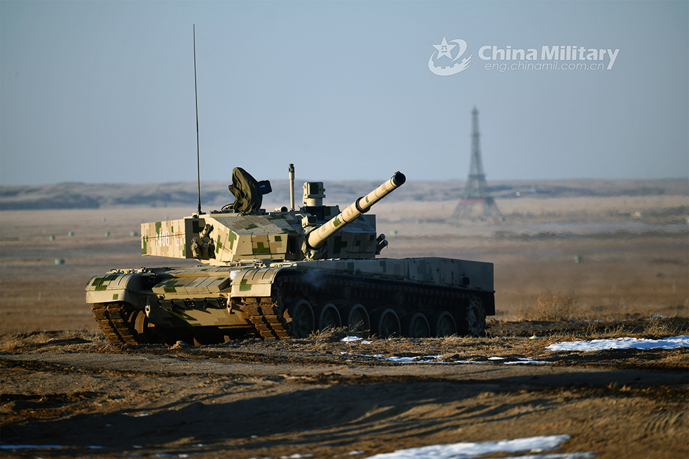 A main battle tank (MBT) attached to a tank element of a combined-arms brigade under the PLA 81st Group Army conducts a maneuver during a recent live-fire tactical training exercise. (eng.chinamil.com.cn/Photo by Yang Pengfei and Li Changxing)