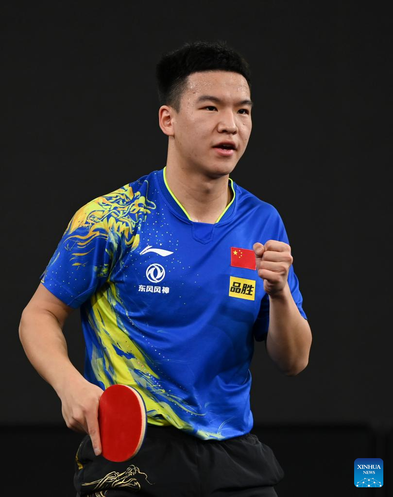 Xiang Peng of China reacts during the men's singles round of 32 match against Amir Hossein Hodaei of Iran at World Table Tennis Championships (WTTC) Asian Continental Stage in Doha, Qatar, Jan. 10, 2023. (Photo by Nikku/Xinhua)