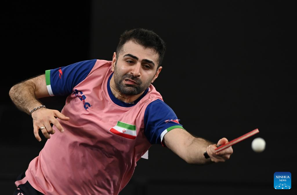 Noshad Alamiyan of Iran hits a return during the men's singles round of 32 match against Wang Chuqin of China at World Table Tennis Championships (WTTC) Asian Continental Stage in Doha, Qatar, Jan. 10, 2023. (Photo by Nikku/Xinhua)