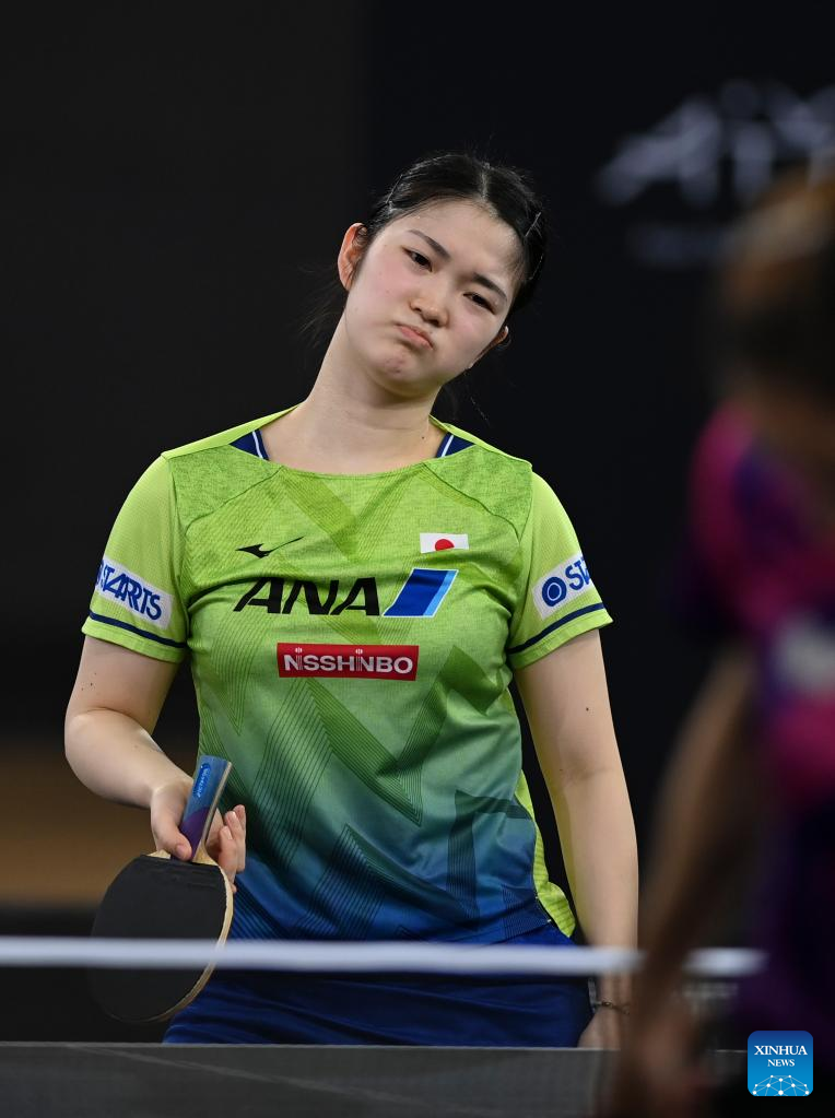 Kihara Miyuu of Japan reacts during the women's singles round of 32 match against Liu Hsing-Yin of Chinese Taipei at World Table Tennis Championships (WTTC) Asian Continental Stage in Doha, Qatar, Jan. 10, 2023. (Photo by Nikku/Xinhua)
