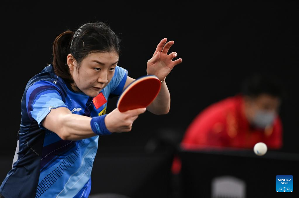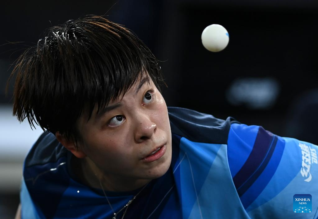 Chen Meng of China hits a return during the women's singles round of 32 match against Ng Wing Lam of China's Hong Kong at World Table Tennis Championships (WTTC) Asian Continental Stage in Doha, Qatar, Jan. 10, 2023. (Photo by Nikku/Xinhua)