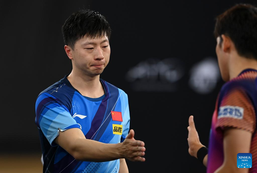 Ma Long (L) of China shakes hands with Yoshimura Maharu of Japan during their men's singles round of 32 match at World Table Tennis Championships (WTTC) Asian Continental Stage in Doha, Qatar, Jan. 10, 2023. (Photo by Nikku/Xinhua)