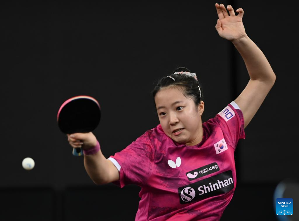 Shin Yubin of South Korea hits a return during the women's singles round of 32 match against Orawan Paranang of Thailand at World Table Tennis Championships (WTTC) Asian Continental Stage in Doha, Qatar, Jan. 10, 2023. (Photo by Nikku/Xinhua)