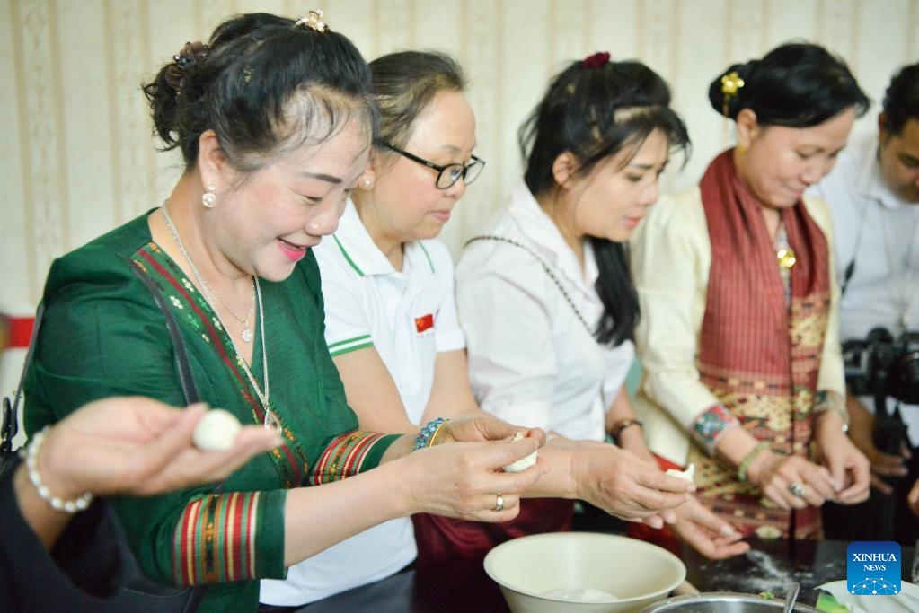 President of the Lao Women's Union Inlavanh Keobounphanh (1st R) makes dumplings with alumni from "67" School at the China Cultural Center in Vientiane, Laos, Jan. 10, 2023. (Photo by Tamon Huengmeexay/Xinhua)