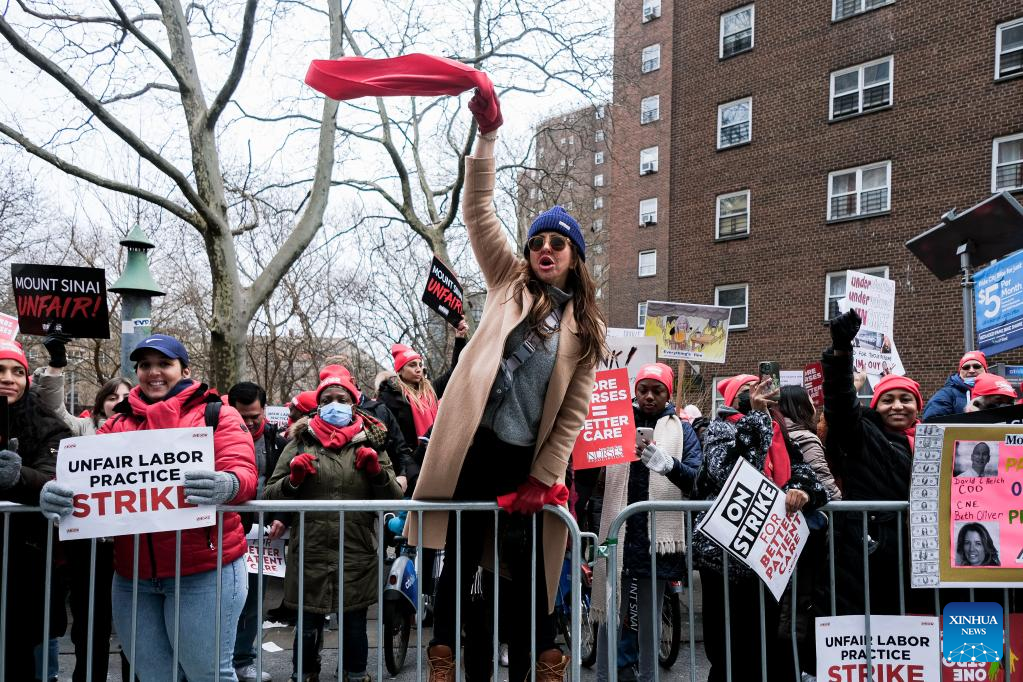 A protester waves to pedestrians outside Mount Sinai Hospital in Manhattan, New York, the United States, on Jan. 11, 2023. Thousands of nurses from New York City's Mount Sinai Hospital and Montefiore Bronx continued to be on strike the third day on staffing shortage, low wage and other issues. (Photo by Ziyu Julian Zhu/Xinhua)