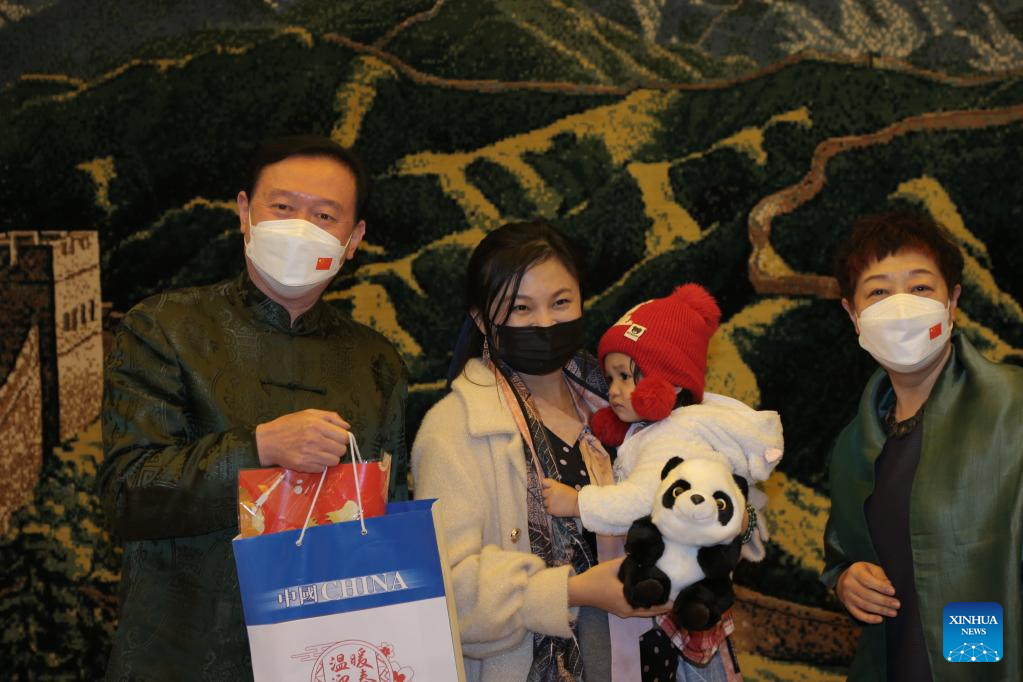 During the get-together, the ambassador and his wife also distributed Spring Festival kits to the representatives of overseas Chinese groups, and presented the children with panda dolls, pop-up books and other gifts. They also introduced celebration traditions to the children and led them to experience one of them by pasting Spring Festival Couplets beside the door.