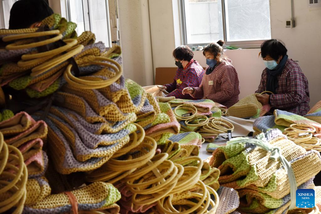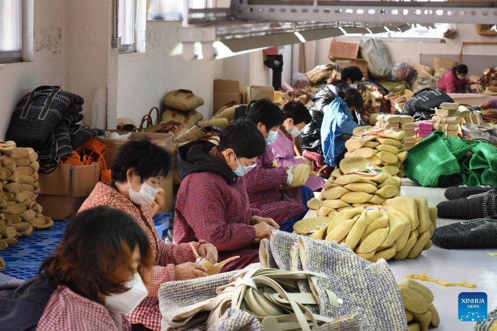 Employees process straw weaving at a handicraft factory in Pingdu, east China's Shandong Province, Jan. 10, 2023. (Xinhua/Li Ziheng)