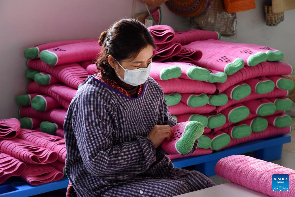 An employee makes straw weaving products at a handicraft factory in Pingdu, east China's Shandong Province, Jan. 10, 2023. (Xinhua/Li Ziheng)