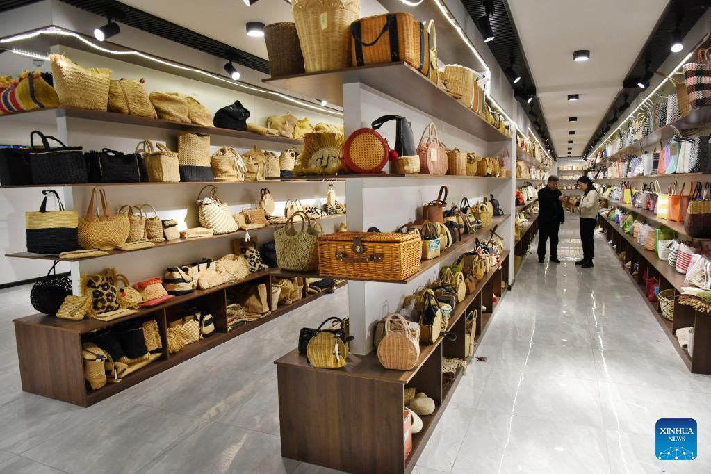 This photo taken on Jan. 10, 2023 shows straw weaving products at the showroom of a handicraft enterprise in Xinhe Town, Pingdu City, east China's Shandong Province. (Xinhua/Li Ziheng)