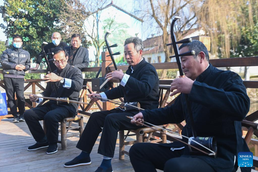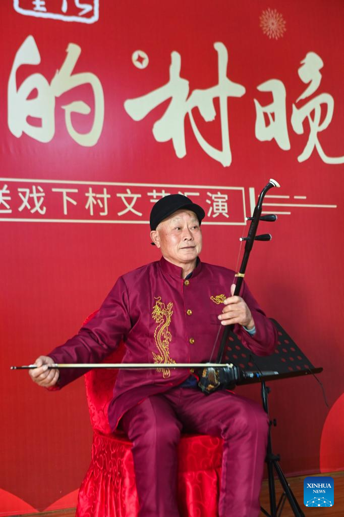 A volunteer plays Erhu, a Chinese musical instrument, at an auditorium in Shijiaqiao Village of Wuxing District in Huzhou, east China's Zhejiang Province, Jan. 11, 2023. The performance was held to greet the upcoming Spring Festival. (Xinhua/Xu Yu)