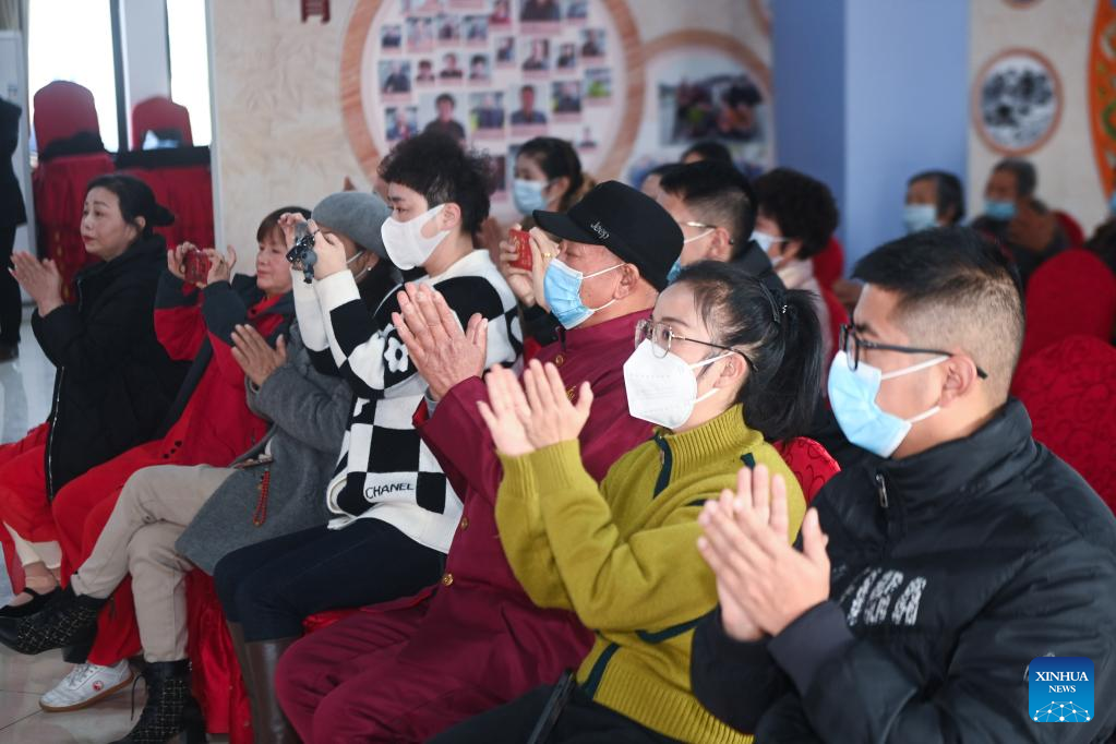 Villagers applaud a performance at an auditorium in Shijiaqiao Village of Wuxing District in Huzhou, east China's Zhejiang Province, Jan. 11, 2023. The performance was held to greet the upcoming Spring Festival. (Xinhua/Xu Yu)